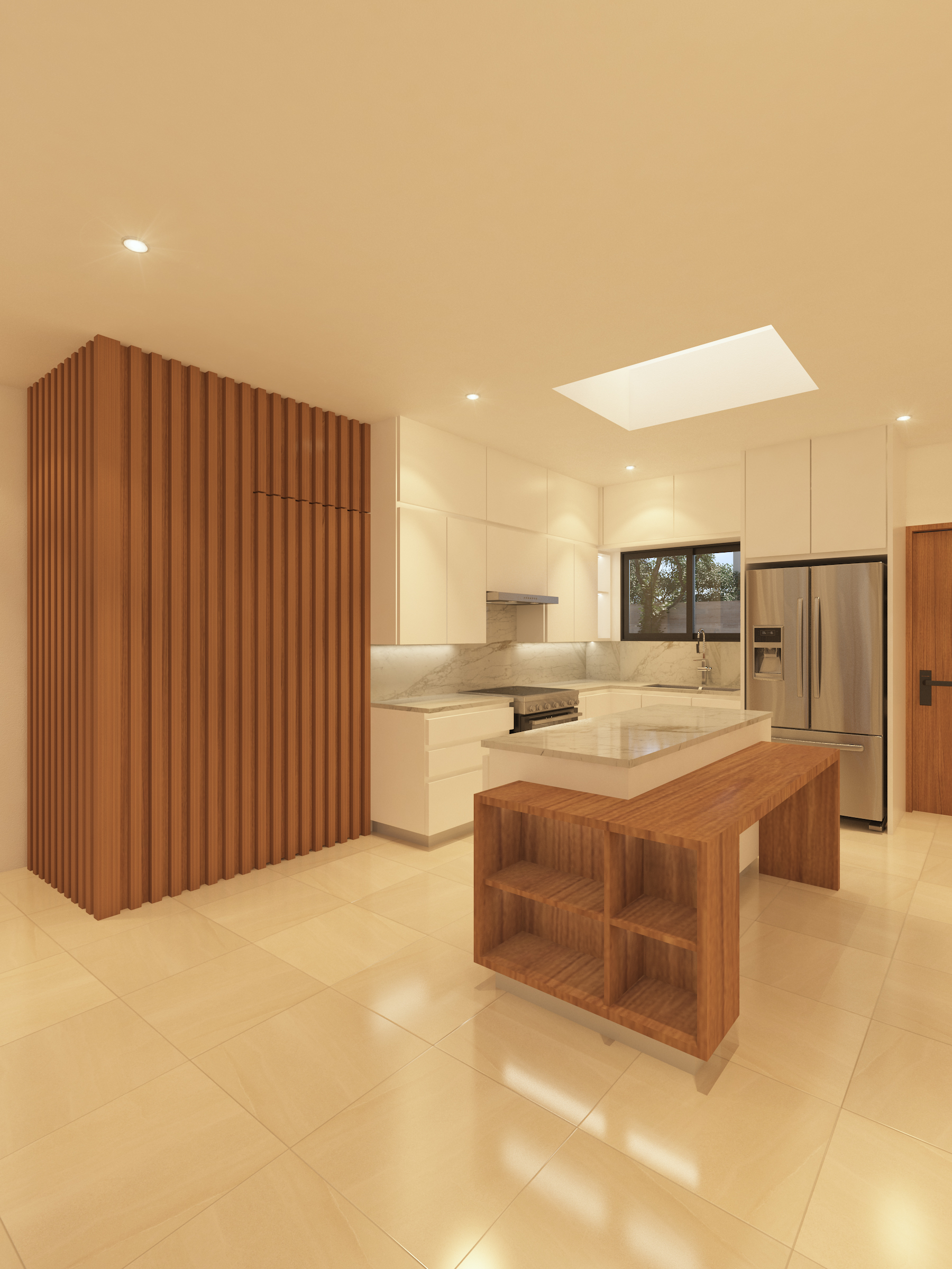 -Cocina tipo social en concepto abierto, con amplia isla desayunador e integrada visualmente