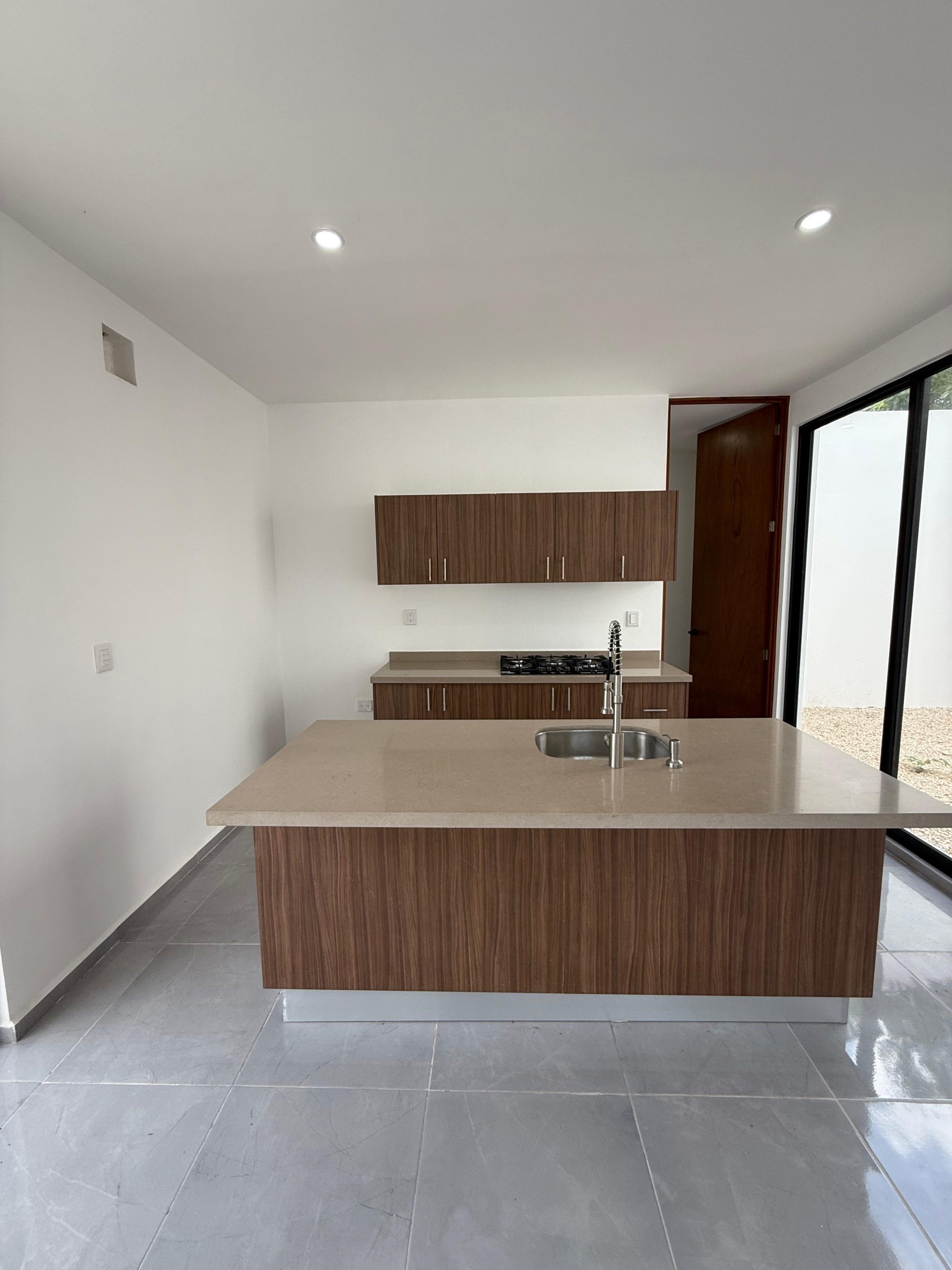 Cocina equipada con isla y cubierta de granito + cuarto de alacena
