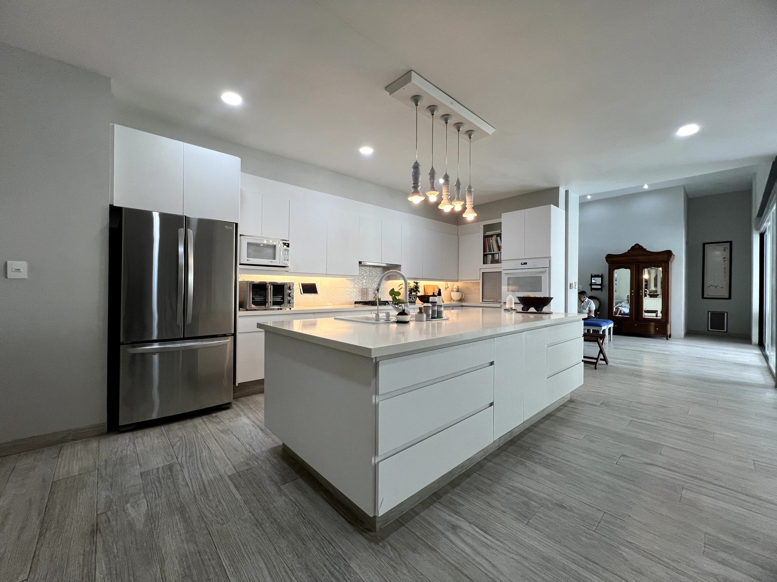 Cocina enorme con isla central de cuarzo en concepto abierto totalmente equipada